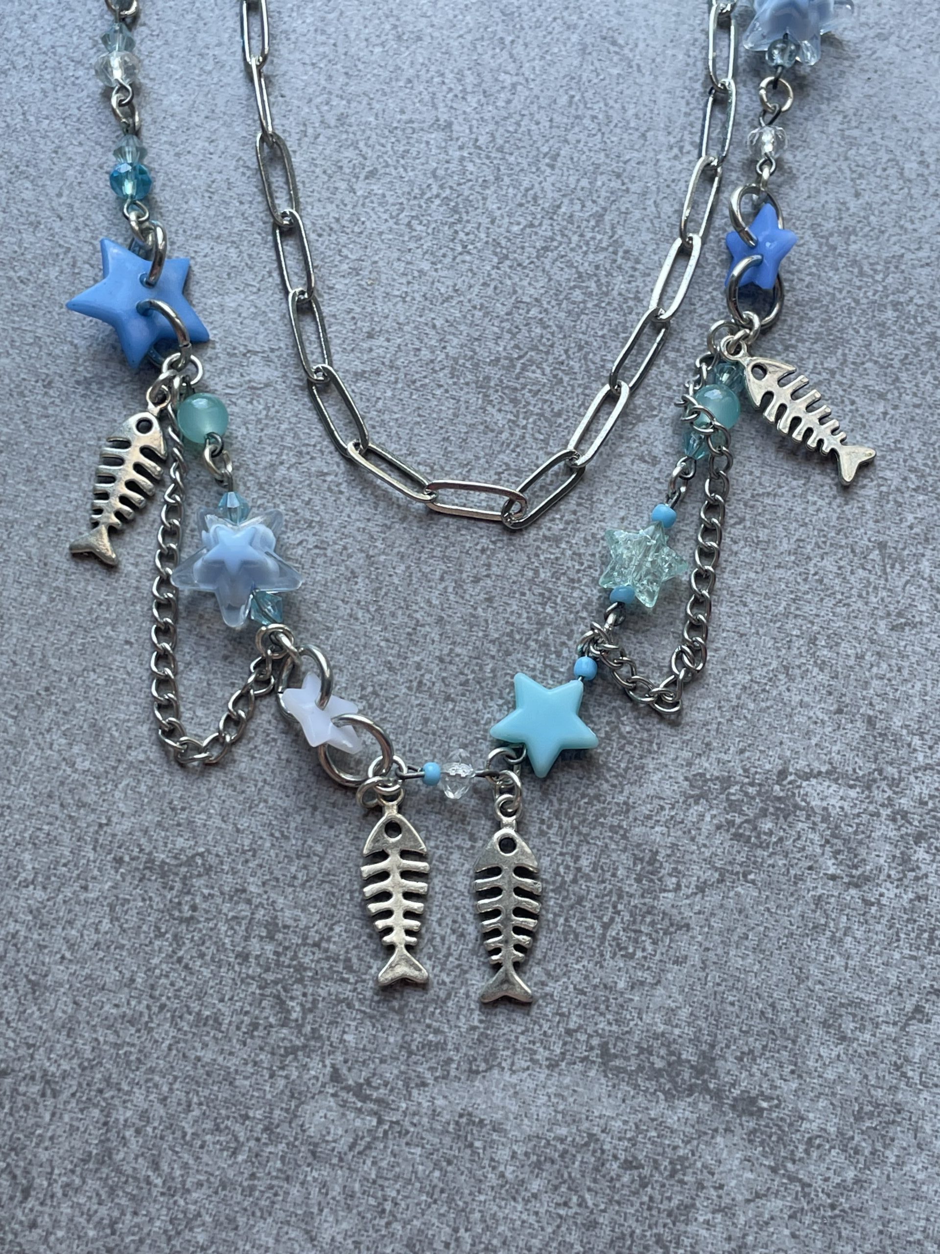 made with plastic star beads, glass beads, thrifted beads, buttons, chain and metal pendants