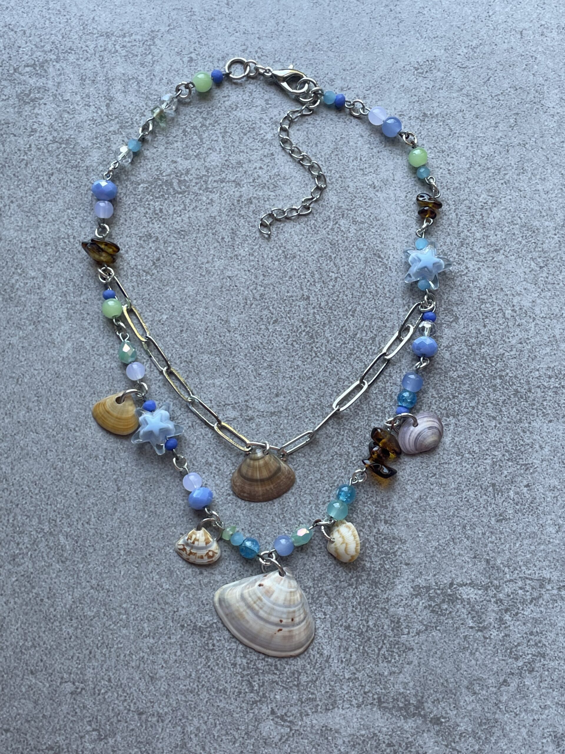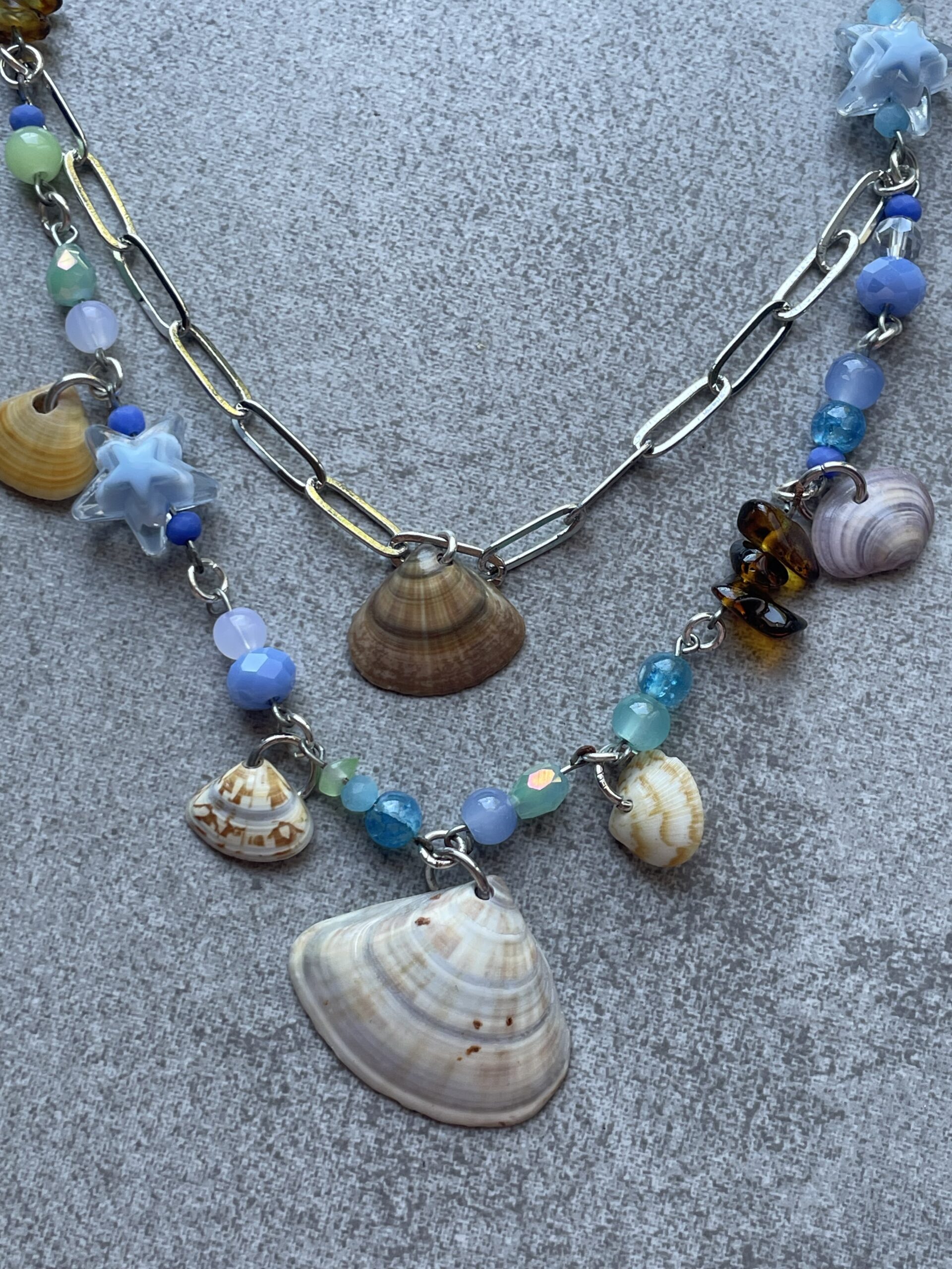made with real shells, glass beads, crystal beads, plastic beads, faux crystal beads and chain.